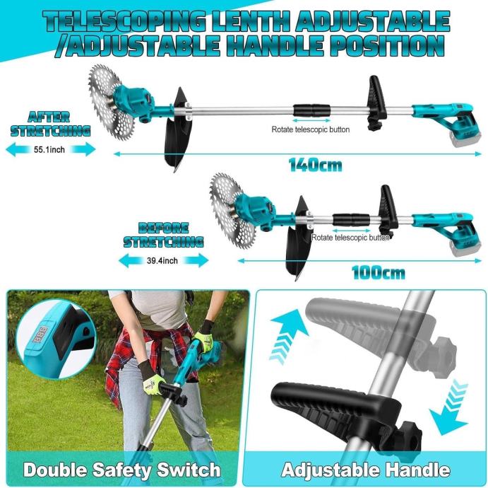 Bežični trimer s teleskopskom ručkom: Teleskopska šipka trimera može se podesiti, a duljina električnog trimera može se slobodno podesiti od 90 do 130 cm kako bi se smanjio pritisak na donji dio leđa, pogodno za različite visine, pogodno za starije osobe, žene i početnike.