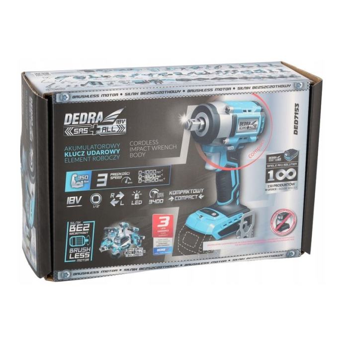 to je alat koji će svoju glavnu primjenu naći u mehaničarskim ili servisnim radionicamazahvaljujući velikom okretnom momentu od 350 Nm, ovaj je ključ savršen za odvrtanje zaglavljenih vijakauređaj će također dobro funkcionirati u svim vrstama radova koji uključuju spajanje drvenih i čeličnih konstrukcijaključ je opremljen motorom bez četkica, čija je prednost puno veća učinkovitost i izdržljivost od tradicionalnog motora s četkicamakućište je izrađeno od najlona s dodatkom staklenih vlakana, što povećava otpornost na mehanička oštećenja i UV zračenjeTehnički opis: motor bez četkica - manja stopa kvarova uz povećanu učinkovitost kompaktne dimenzije [170 mm], olakšavaju rad na teško dostupnim mjestima glatka regulacija brzine vrtnjetrostupanjsko podešavanje maksimalnog momentadodatna kopča za remen gumirana drška rotacija desno-lijevo LED osvijetljenje 1/2" montažni nosač veliki okretni moment Tehnički podaci:napon: 18V snaga: 350 Nmbrzine rotacije: 0-1000 okretaja u minuti0-1800 okretaja u minuti0-2500 okretaja u minutizakretni momenti:100 Nm200 Nm350 Nmbroj udaraca u minuti: 0-3400 BPM približna vremena rada za baterije:2Ah - DED7032: 280 vijaka (odvrtanje vijaka kotača u osobnom automobilu)4Ah - DED7034: 560 vijaka (odvrtanje vijaka kotača u osobnom automobilu)5Ah - DED7035: 700 vijaka (odvrtanje vijaka kotača u osobnom automobilu)6Ah - DED6936: 840 vijaka (odvrtanje vijaka kotača u osobnom automobilu)8Ah - DED6937: 1120 vijaka (odvrtanje vijaka kotača u osobnom automobilu)Proizvod ne sadrži bateriju niti punjač.Prilikom kupnje ne zaboravite na punjač i bateriju.kompatibilne baterije: DED7032, DED7034, DED6937kompatibilni punjači: DED7038, DED7039]]>