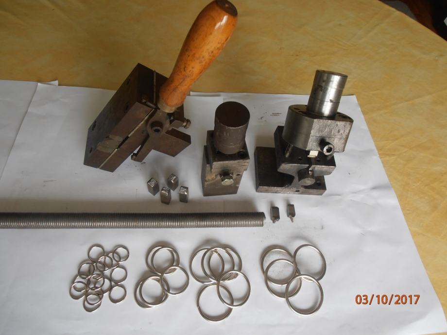 Alati komplet za odsijecanje i ravnanje čeličnih karika raznih veličina s više rezervnih stiria čelika za noževe, malo korišten i ispravan, ostatak od zatvaranja obrta.