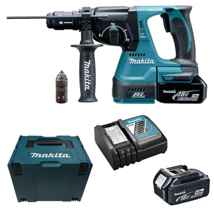 Makita akumulatorski kombinirani čekić DHR243RTJ + 2x punjiva baterija 5,0 Ah + punjač + kofersnažna udarna bušilica sa silom jednog udarca do 2,0 džulakapacitet bušenja u betonu do 24 mmintegrirani priključak za usisavanje prašineklizna spojkabrzoizmjenjiva stezna glava za cilindrične bušilicepodešavanje dlijeta u 40 položajaprikladno za bušenje, bušenje čekićem i klesanjeTehnički podaci:motor bez četkicasustav baterija: LXTnapon baterije: 18 Vsustav zaštite baterijebroj okretaja u praznom hodu: 0 - 950 min-¹brzina udara bez opterećenja: 0 - 4700 min-¹sila pojedinačnog udara: 2,0 Jrazina zvučnog tlaka: 89 dB(A)kapacitet bušenja u drvo: 27 mmkapacitet bušenja u betonu: 24 mmkapacitet bušenja u čeliku: 13 mmdimenzije (D x Š x V): 353 x 85 x 213 mmtežina uklj. baterija: cca. 3,4 - 4,9 kg (ovisno o korištenoj bateriji)]]>