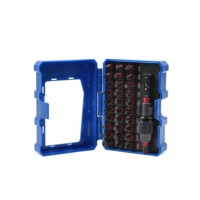 materijal: čelik S2.Uključuje: magnetski brzoizmjenjivi držač bitova4 x Phillips nastavci od 25 mm: PH1, PH2 (x2), PH34 x PoziDriv 25 mm bita: PZ1, PZ2 (x2), PZ312 x Torx 25 mm bitova: TX10 (x2), TX15 (x2), TX20 (x3), TX25 (x2), TX30 (x2), TX407x Torx s rupom od 25 mm Bitovi: TX B07, TX B08, TX B09, TX B010, TX B015, TX B020, TX B0254 x šesterokutna nastavka od 25 mm: 3, 4, 5, 6 mm]]>