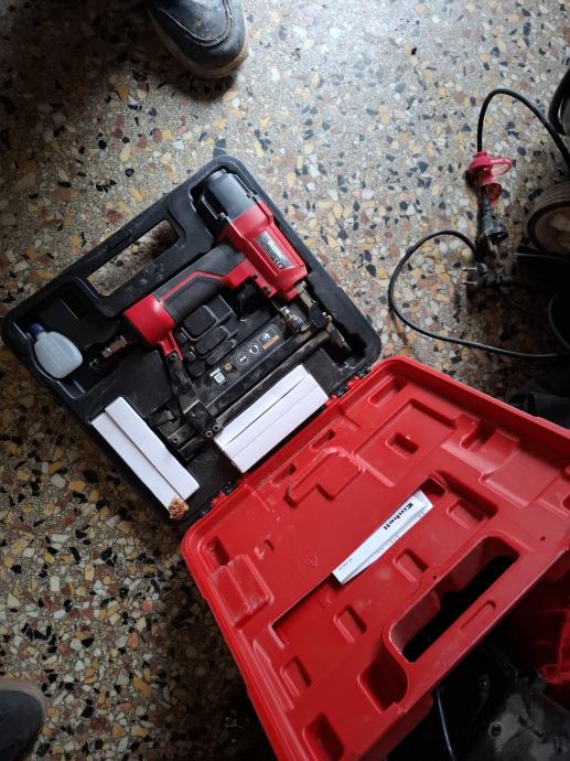 Prodajem Einhell kompresor zajedno s pneumatskim pištoljem za čavle. Set dolazi u praktičnom crvenom koferu za lakši transport i skladištenje. Kompresor omogućava rad s pneumatskim alatima, a pištolj za čavle idealan je za razne stolarske i građevinske radove - postavljanje obloga, pričvršćivanje lajsni, montažu namještaja i slične primjene. Sve je funkcionalno i spremno za korištenje.