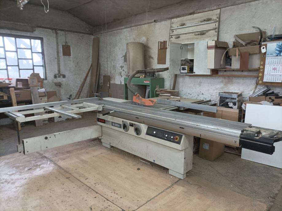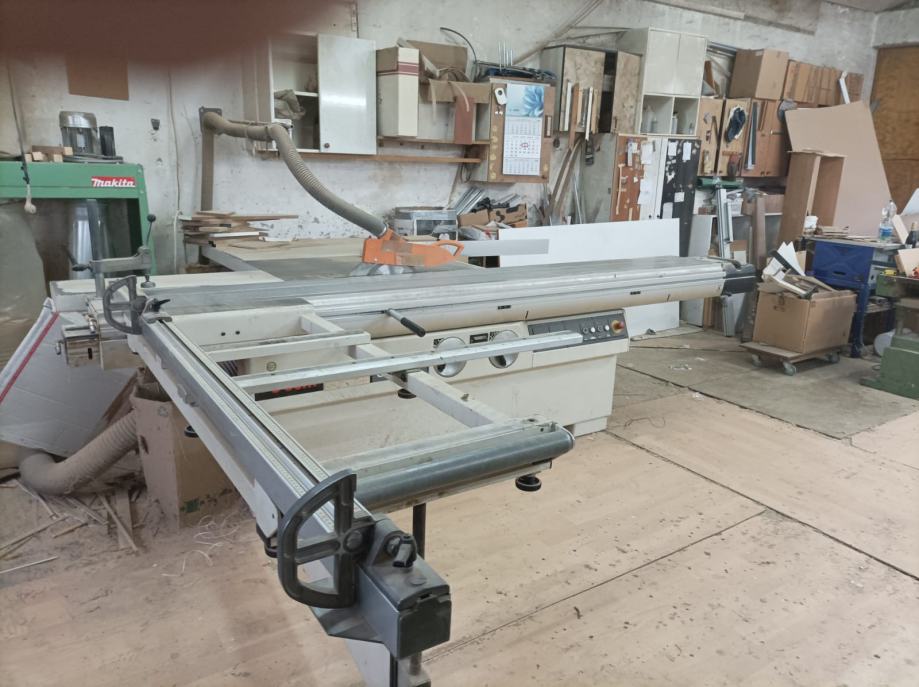 Duzina stola 320 cm, sirina 40 cm, stol desno 140 cm, lijevo 215 cm, produživo do 380 cm. Pneumatska letva za pritisak ploče po cijeloj dužini stola. Pila 4000 okretaja, predrezak 8000 okretaja. Pila max 350 mm, predrezač 125 mm. Snaga 4 kw+1 kw. Nagib pile 45° udesno. Stol i letva za rezanje pod kutem. Težina stroja 960 kg. Malo korišteno. Cijena 6000 €.