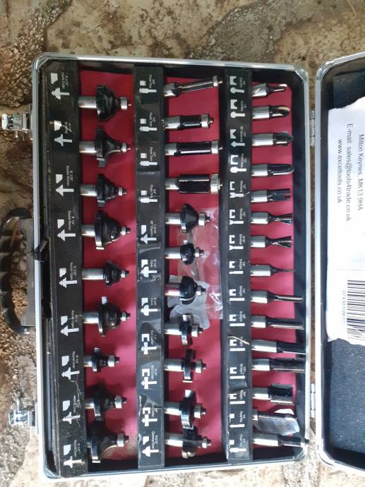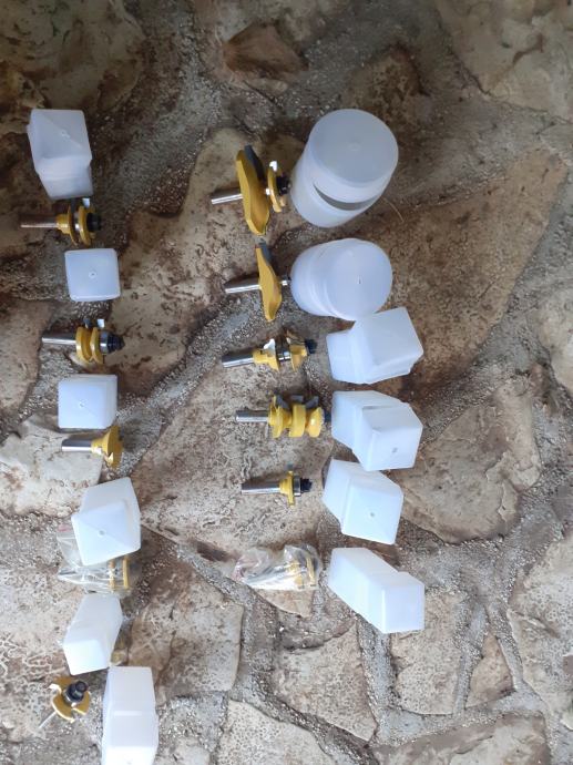 Nikada korištena razna glodala za obradu drva, uglavnom 12.7mm. Profil, kontra profil, uklade i ostalo. Prihvat za glodala za frezer M14 za 12mm, tj. priložena glodala bi trebalo istokariti na 12mm ili promijeniti čahuru. U setu se nalazi i nož profil kontra profil za kuhinje korišten svega jednom.