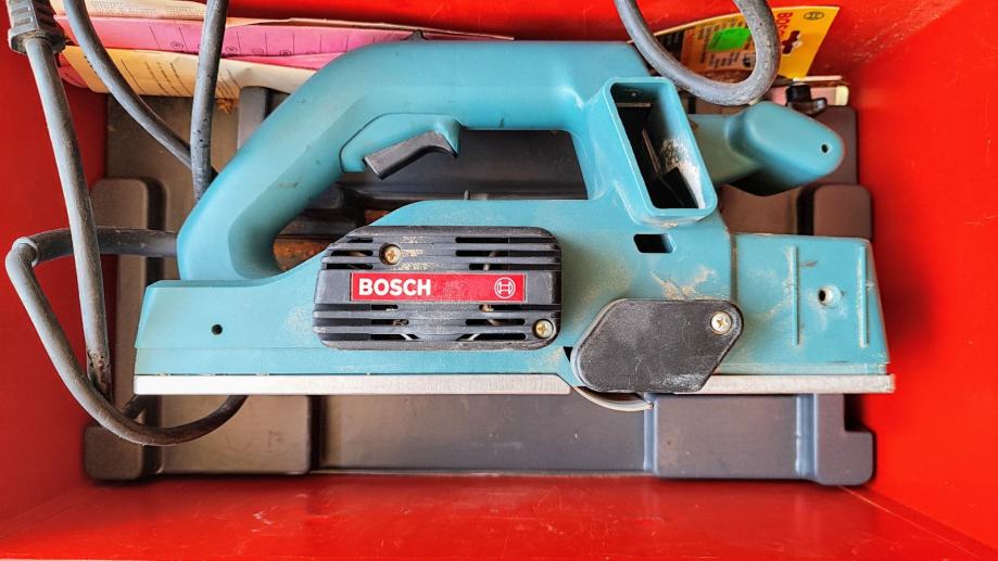 Profesionalni alati BOSCH plave boje sa dijelovima za dugotrajan rad pod otežanim uslovima. Ova hoblerica ide sa limenim koferom i setom zamjenskih noževa i originalnom knjižicom.