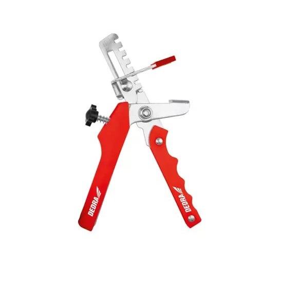 Univerzalna kliješta za sustave za izravnavanje pločica je alat koji ne može nedostajati prilikom postavljanja pločica i sl. Kliješta služe za precizno, učinkovito i brzo izravnavanje keramičkih pločica pomoću sustava za izravnavanje pločica. Proizvod je kompatibilan s mnogim sustavima dostupnim na tržištu. Kliješta preporučena za setove za polaganje pločica DED02P110 , DED02P111 , DED02P112 , DED02P205 , DED02P305 Tehnički podaci: Duljina kliješta: 230 mm