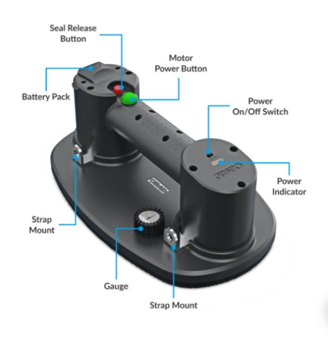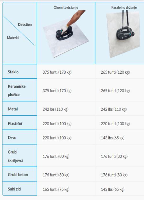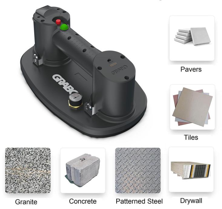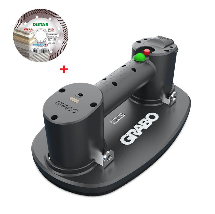 1 torba za nošenje od čvrste tkanine S ovim najboljim alatom u klasi, ispunjavamo naše obećanje o "Lakom podizanju teških tereta". Sada se ne morate oslanjati na glomazne i složene dizače teških tereta. Ne morate brinuti ni o nepouzdanim i često opasnim ručnim vakuumskim držačima. Uz GRABO dobivate najbolje od oba svijeta. S kojim materijalima radi GRABO ? GRABO Plus je idealan alat za podizanje (premještanje) keramike, opločnjaka, radnih ploča, vrata, ploča itd. Alat savršeno radi sa staklom, drvom, keramičkim pločicama, metalima i drugim materijalima. Alat radi pri maksimalnom kapacitetu vakuuma od 11,6 psi, s optimalnom sposobnošću podizanja tereta teških čak do 170 kg. Izuzetan je za lijepljenje pločica velikog formata s preciznošću i bez puno muke. Na koji način radi GRABO ? GRABO Plus opremljen je snažnom vakuumskom pumpom koja radi u tandemu s robusnom brtvom od pjene. Za podizanje bilo koje ravne ploče od čvrstog materijala jednostavno uključite jedinicu i postavite je ravno na površinu. Nakon što se aktivira vakuumska pumpa, ona stvara snažno usisavanje i čvrsto prianja na bilo koju neporoznu ravnu površinu. To olakšava podizanje panela ili ploča ili predmeta od različitih materijala. Za maksimalno podizanje, vakuumska pumpa može biti uključena čak i tijekom podizanja ili pomicanja tereta. Vakuumska pumpa se može isključiti i tijekom pomicanja tereta koji nema preveliku masu. Međutim, držanje vakuumske pumpe aktiviranom tijekom prijenosa materijala također osigurava maksimalnu sigurnost jer čak i ako postoji curenje zraka zbog stranog materijala ili prljavštine na materijalu, kontinuirano djelovanje vakuumske pumpe održava konstantan tlak. Manometar zaštićen gumom omogućuje korisniku praćenje razine vakuumskog tlaka u skladu s kapacitetom dizanja za bilo koji materijal. Nakon što završite s pomicanjem i postavljanjem predmeta, jednostavno pritisnite crvenu tipku za oslobađanje vakuuma kako biste oslobodili vakuum i prijeđite na sljedeći predmet koji želite podići.