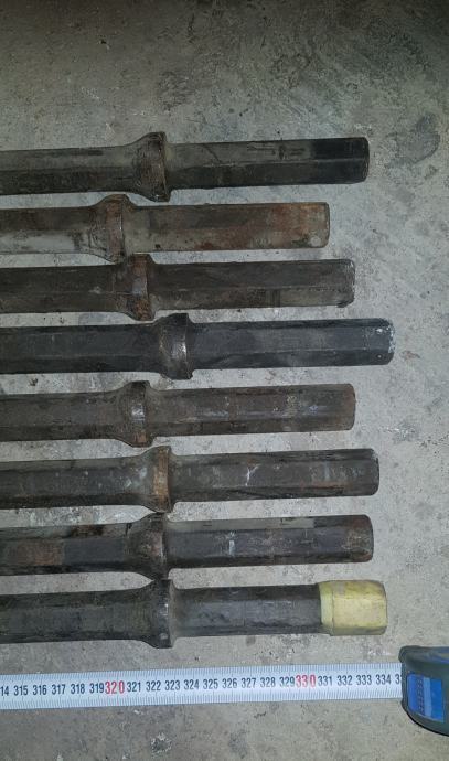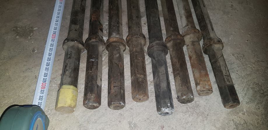 Prodajem nekorištene dobro očuvane, nove monoblok rudarske bušače šipke (monoblok dijetlo, štamp, trapalj, trapanj, tzv. "svrdla za bušenje kamena"). Originalni bušači kut svima je od 110°, te su skladišteni uredno na ravnom podu i premazani uljem da ne ruzinave (da hrđa ne izvlači ugljik (C) iz čelika/željeza).