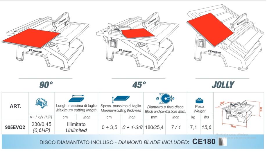 Montolit F2 je električna pila za rezanje pločice hlađena vodom, dizajnirana za rezanje malih pločica, s profesionalnim diskom i kontinuiranom krunicom Baza ovog prijenosnog rezača izrađena je od ABS-a otporne na udarce dok jeradna površina izrađena od nehrđajućeg čelika. Omogućuje jednostavne ravne rezove, kutove od 45 stupnjeva i posebne rezove. Standardno se isporučuje s posebnim dijamantnom reznom pločom (180 mm) za keramičke i porculanske pločice Kompaktna i laka za transport, s praktičnim namatačem kabela. Beskonačna efektivna dužina rezanja. Dimenzija diska 180/25,4mm Maksimalna debljina pločice 35mm Težina 7,1kg Napon 230V Snaga: 0,45kW https://www.youtube.com/watch?v=0H6yNfM8bsQ