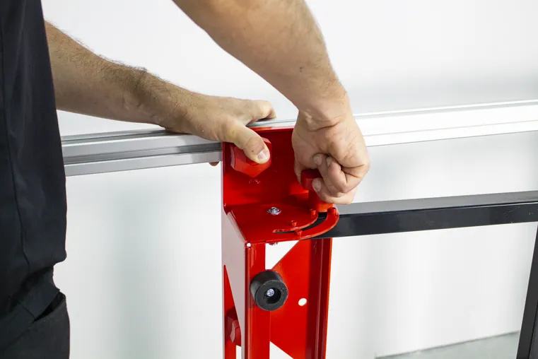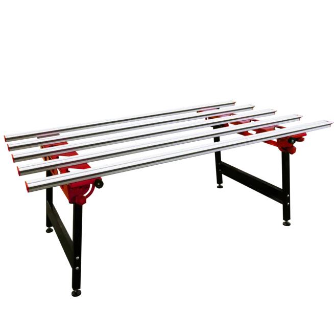Radni stol za rezanje i rukovanje keramičkim pločama velikog formata. Dodatno ojačane aluminijske šipke daju SLAB radnom stolu visoku krutost i veliku stabilnost. Pružaju mu maksimalnu nosivost do 250 kg. Radna visina stola je 70 cm. Odvajanje njegovih 5 aluminijskih šipki omogućuje korisniku bušenje i rezanje bez straha od oštećenja samog stola. Struktura SLAB TABLE-a, zajedno s nogama za niveliranje, postiže veću stabilnost cijelog sklopa*. Zahvaljujući EASY FIX sustavu spajanja, montaža i demontaža ovog radnog stola je vrlo jednostavna i brza. Sklopive noge imaju sigurnosni sustav koji sprječava njihovo nehotično zatvaranje. Sa sklopljenim nogama, SLAB TABLE je visok manje od 20 cm, tako da se može lako skladištiti. Rubi STOL uključuje konektor s EASY FIX sustavom koji omogućuje spajanje dvaju stolova i time formira radnu površinu idealnu za keramičke ploče velikog formata. STOL ima duljinu od 180 cm i širinu od 104 cm. Stoga se spajanjem dvaju stolova dobiva površina za oslonac od 360 cm. Opremljen je gumenim graničnicima sa strane kako bi se spriječilo izravno i nehotično udaranje materijala o stol. Time se smanjuju gubici i nezgode. *Za dobivanje ispravne radne površine, s keramičkim pločama, preporučuje se korištenje 2 jedinice. dimenzije 180 x 104,4 x70cm nosivost 250kg radna visina 70cm težina 36kg