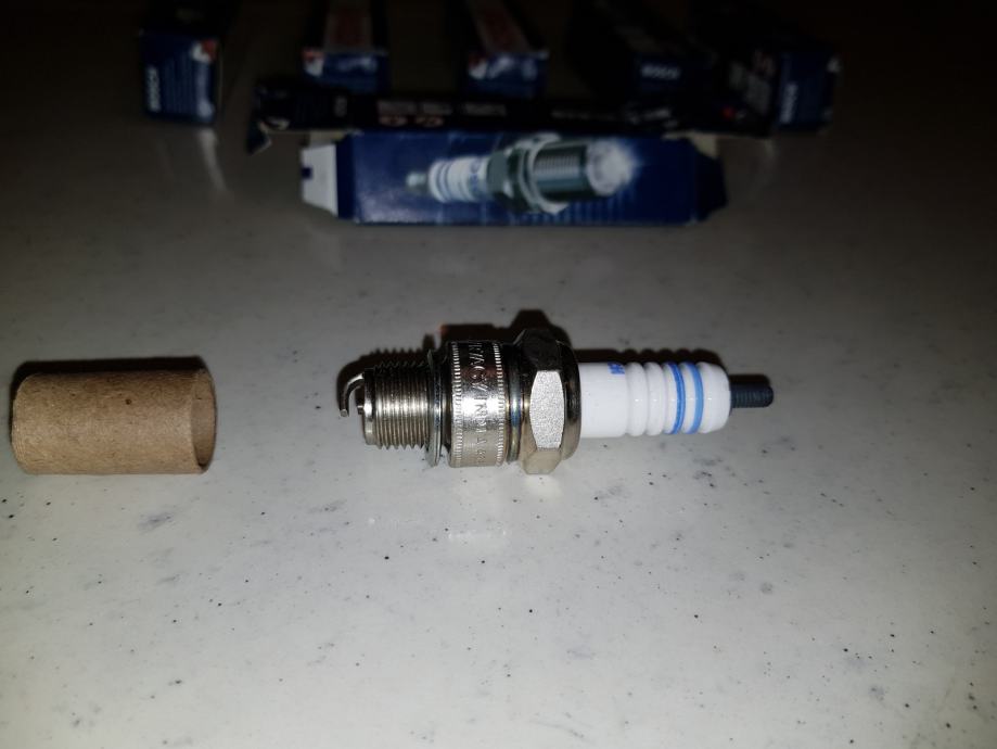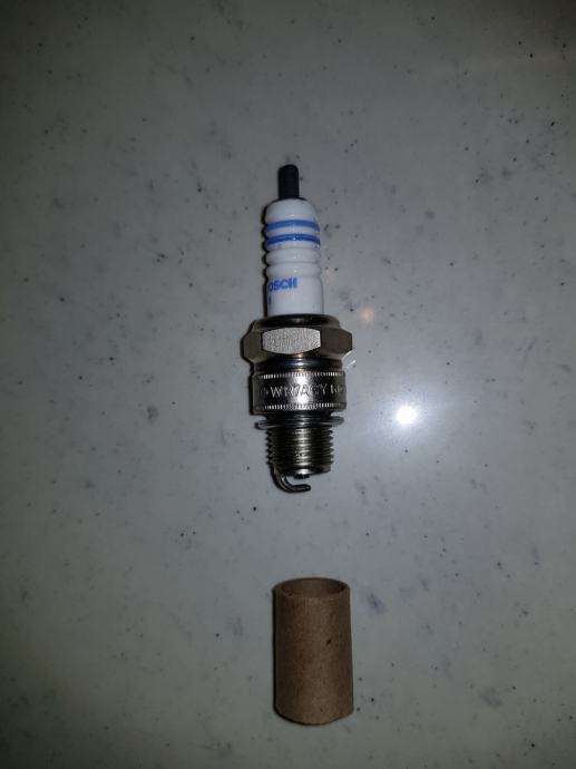 Za paljenje ovakvih strojeva i paljenje ovakvih vrsta mješavine benzina i ulja od 8-9%, je isključivo ova jedina originalna BOSH-ova svjećica punog naziva BOSCH R6 W 7A W 175 T1 - navoj svjećice je 14mm.