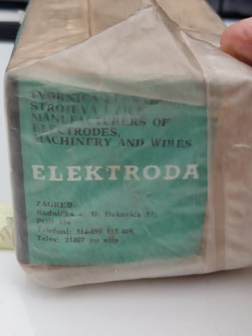 Prodajem nove zapakirane elektrode za željezo. Proizvođač Elektroda Zagreb. Težina 3,5 kg, promjer 2,5 mm i dužine 350 mm. Čekić za šljaku gratis.