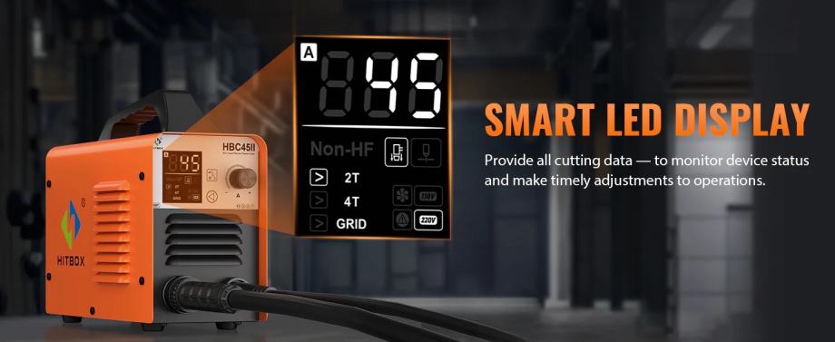 Nadograđeni LED digitalni zaslon i 2T/4T načini rada: HITBOX HBC45II ima LED digitalni zaslon visoke rezolucije za praćenje struje u stvarnom vremenu. Jednostavno prebacivanje između poluautomatskog (2T) i automatskog (4T) načina rezanja prema vašim potrebama. Sustav kodova grešaka osigurava brzo rješavanje problema, štedeći vrijeme i trud.