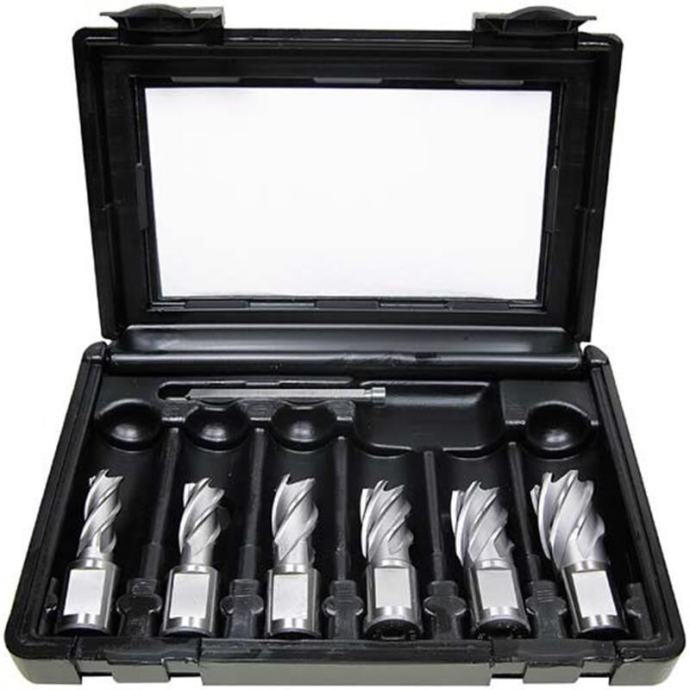 Set kernborera ili jezgrenih svrdala, weldon 19 prihvat za magentne bušilice (dostupni adapteri za uporabu na stupnim bušilicama ili adapteri za Fein / Hitachi tip prihvata na magnetnim bušilicama), promjeri u setu 12, 14, 16, 18, 20 i 22 mm + pilot igla. Proizvođač Alfra Njemačka.
