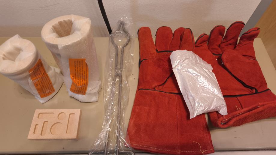 U paketu dolaze kabel za napajanje, keramičke posude za taljenje od 1kg i 3kg, keramički kalup i kliješta za rukovanje.
