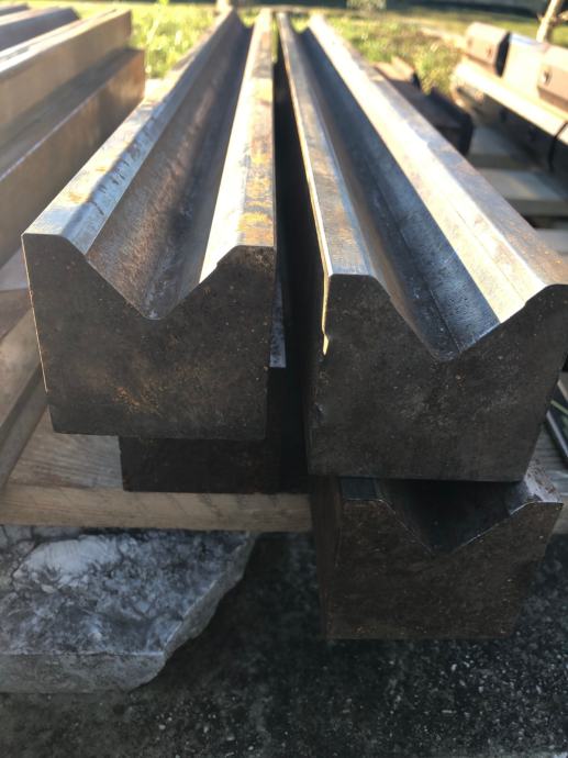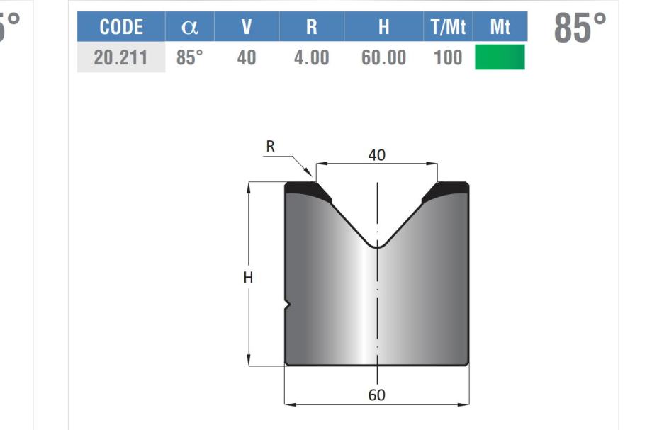 Matrica-prizma za savijačicu-abkant prešu TS20.211, 4 komada od L=835 mm, utor V=40 mm, kut 85 st., radijus 4 mm, H=60 mm, max. 100 T/m. Širina stope 60 mm. Cijena je za cijeli komplet, ukupne dužine matrica 3340 mm.