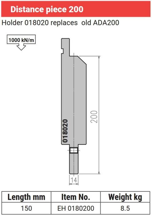 Produžetak-nosač alata za savijačicu-abkant prešu original AMADA ADA200, 1 komad od L=150 mm i H=200 mm, rabljena u dobrom stanju. Idealno za izradu malih kutija.