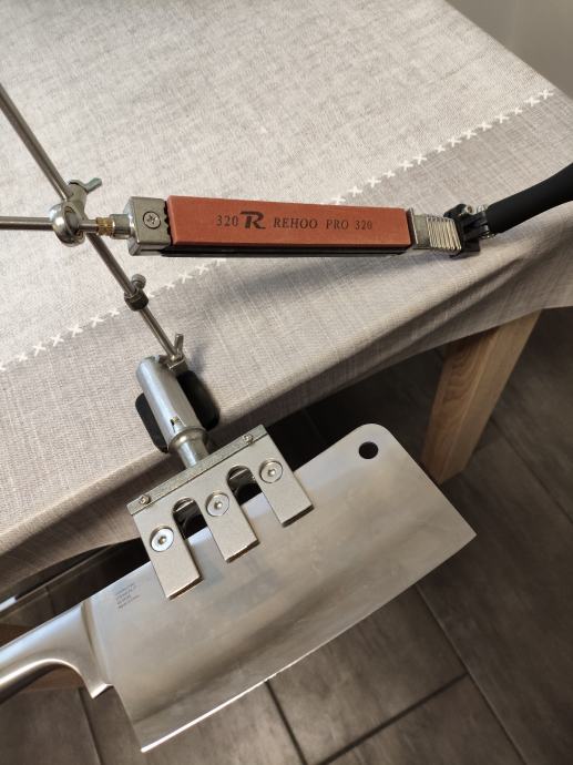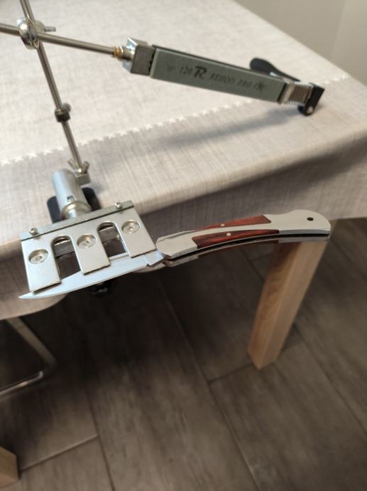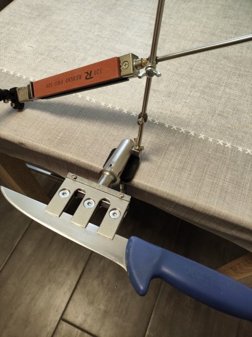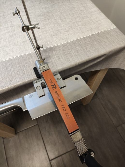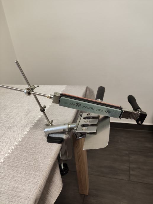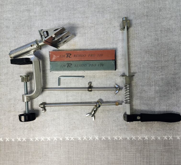 Nova generacija oštrača koja se može rotirati 360° i učvršćuje se postojećom stegom na radnu površinu.Ovaj proizvod izrađen je od inox-a izuzetne kvalitete. Brz i lagan način za oštrenje noževa. Komplet je dizajniran tako da proces izoštravanja nastavi na siguran i prikladan način. Osnovni sustav omogućava stabilno pričvršćivanje noža / škara i podešavanje odgovarajućeg kuta oštrenja Pruža iznimne oštre rubove za bilo koji nož, škare, dlijeta i ostale alate. Brusi, izoštrava i polira kaljeni čelik, legirani čelik i niz drugih metala. Najbitnije je postaviti dobar kut oštrenja, a to je između 10 i 20 stupnjeva. Uz njega idu četri orginalna premium brusna kamena od 120 do 1500 granulata. Dodatna oprema; dijamantni brusevi i originalni kameni brusevi.
