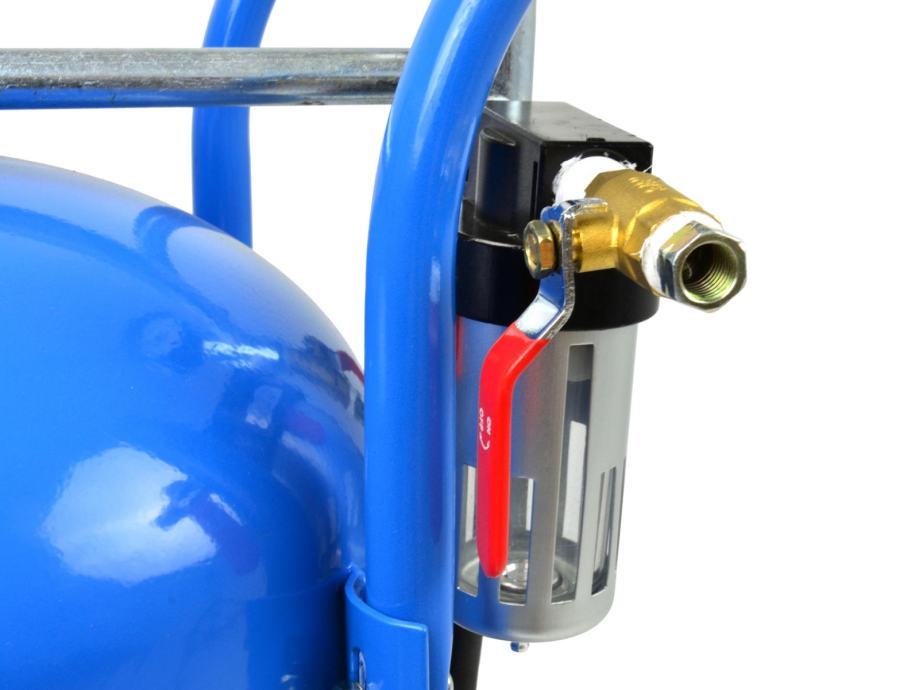 Mobilni tlačna pjeskara (sifonska) kapaciteta 38 litara. Idealno za obnovu, održavanje, radove na lima, strojnoj usluzi i proizvodnim pogonima. Opremljen sa mlaznicama i pištoljem za pjeskarenje, zapornim ventilom, manometrom, crijevom za pjeskarenje, spremnikom za punjenje spremnika i zaštitnom maskom s pleksiglasom.