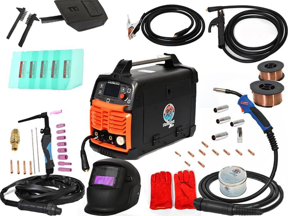 MIG/MAG/FCAW zavarivanje do 200A– zavarivanje u zaštiti plina neaktivni / inertnim (MIG, npr. Argon) ili aktivnim (MAG, npr. CO2) plinovima. Plin i žica za zavarivanje izlaze iz mlaznice gorionika i omogućuju rad jednom rukom.