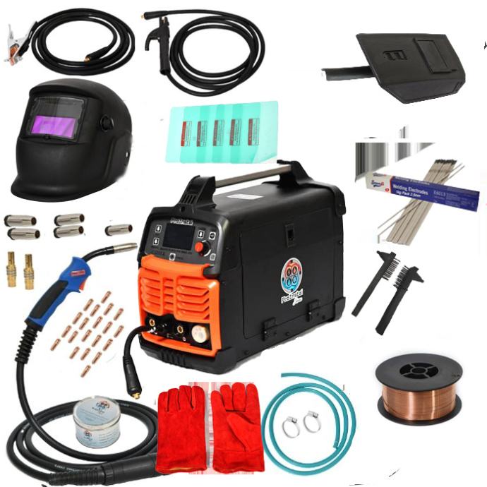 MIG/MAG/FCAW zavarivanje do 200A– zavarivanje u zaštiti plina neaktivni / inertnim (MIG, npr. Argon) ili aktivnim (MAG, npr. CO2) plinovima. Plin i žica za zavarivanje izlaze iz mlaznice gorionika i omogućuju rad jednom rukom.