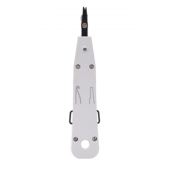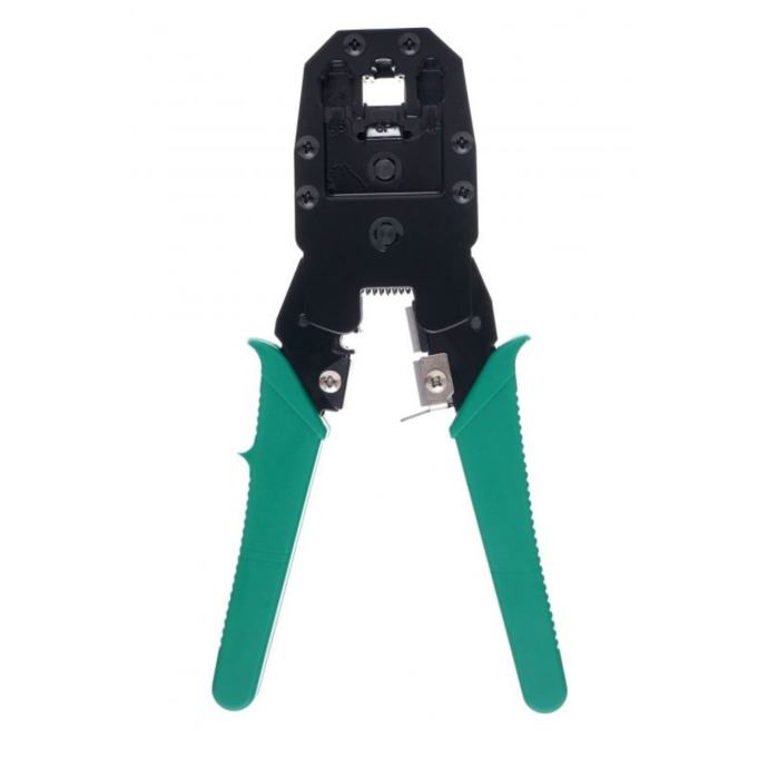 Alat za krimpanje - dizajniran za RJ45 utikače. Uređaj je opremljen s 2 noža - za podrezivanje i skidanje izolacije. Zamjenjive oštrice omogućuju vam da koristite crimper dugi niz godina. Opremljen rezačem, bravom za otvaranje i mehanizmom za bočno stezanje. Izrađen od visokokvalitetnog materijala, ručka je prekrivena protukliznim premazom.