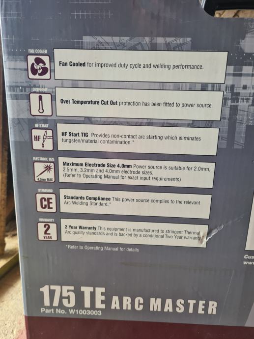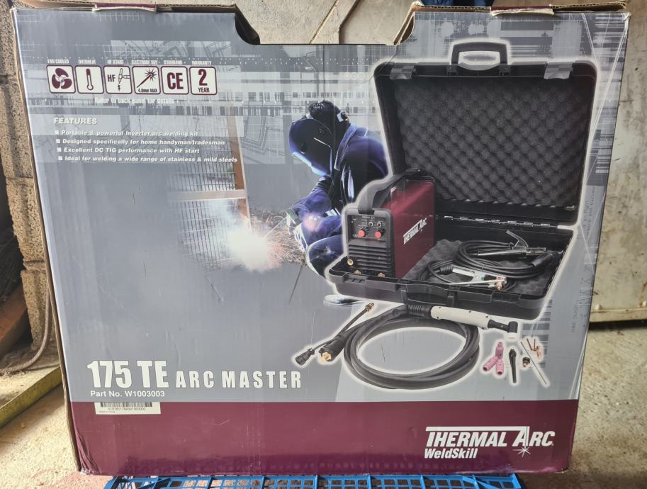Thermal Arc ArcMaster 175 TE (W1003003) prijenosni je inverter aparat za zavarivanje snage 175 ampera, dizajniran za Stick (REL) i TIG postupke. Glavna razlika u odnosu na osnovni "SE" model je dodatak visokofrekventnog (HF) paljenja luka i ugrađenog plinskog ventila za preciznije TIG zavarivanje.