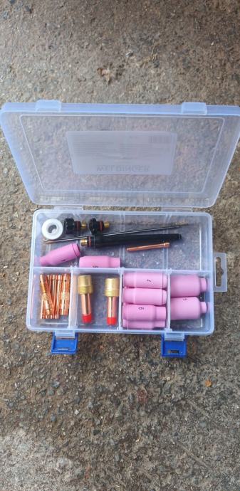 Kutija s TIG potrošnim materijalom (keramike, elektrode, stezaljke, nastavci – vidljivo na slikama)