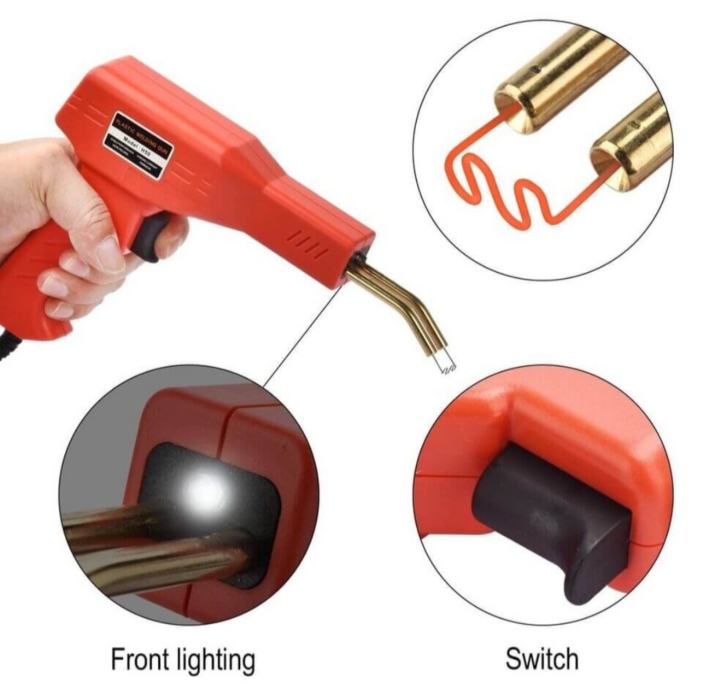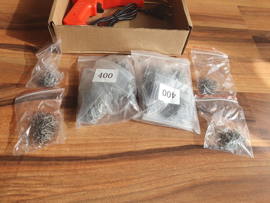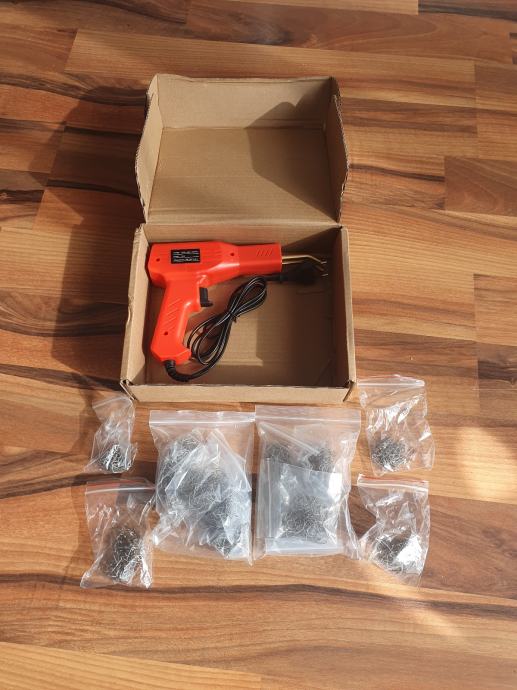 Prodajem komplet, pištolj za zavarivanje plastike s ugrađenom prednjom svijetiljkom i 1000 komada raznih spajalica
