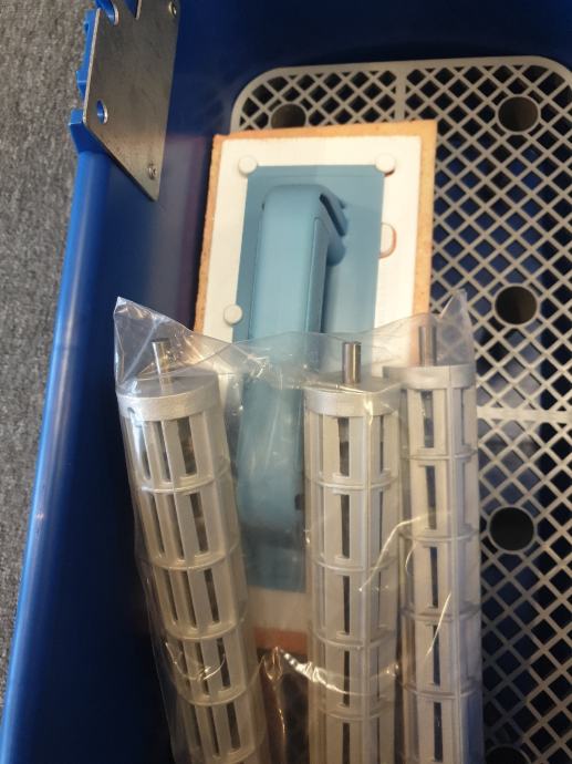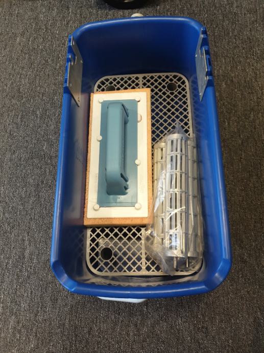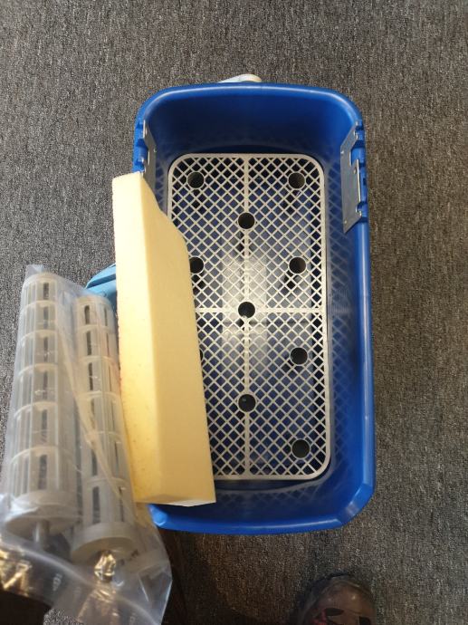3 valjka s metalnim osovinama, spužva sa drškom i plastičnom mrežicom za ispiranje.