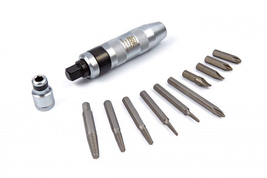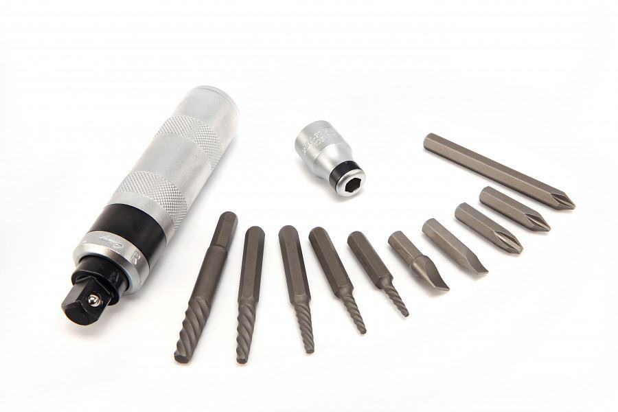1 x udarni odvijač 1x adapter s 1/2 " na 5/16" bit1 x bit križni Ph 21 x bit križni Ph 31 x bit križni Ph 2 - ekstra dugačak1 x bit ravni 8 mm1 x bit ravni 10 mm1 x uklanjanje vijka 1 / M3 - M6alat za uklanjanje svornjaka 1 x 2 / M6 - M8alat za uklanjanje svornjaka 1 x 3 / M8 - M11alat za uklanjanje svornjaka 1 x 4 / M11 - M141 x uklanjanje proboja 5 / M14 - M191 x čelična kutija za odlaganje alata]]>