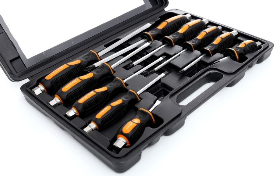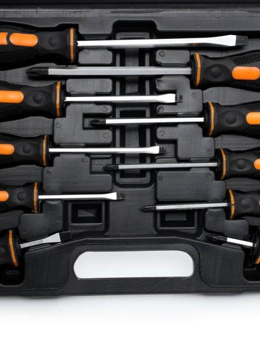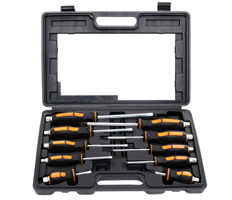 Svaki odvijač ima osovinu koja se proteže kroz cijelu dršku, završenu šesterokutnim pogonom za potporu ključa. Ergonomske, neklizajuće drške osiguravaju siguran hvat i udoban rad, čak i u zahtjevnim uvjetima radionice. Set se isporučuje u čvrstoj kutiji koja štiti alate i olakšava transport i skladištenje.