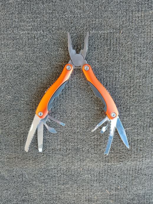 Sadrži klješta, nož, pilu, ravnalo, rašpu grubu i finu, križni šarafciger, ravni šarafciger 3 veličine, otvarač konzervi, otvarač čepova