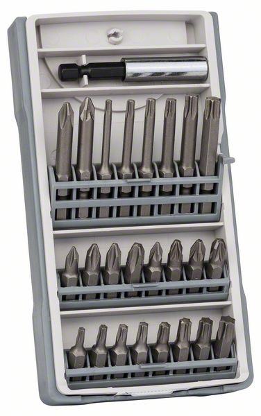 PH1, PH2 (2 x 25 mm), PH3, PZ1, PZ2 (2 x 25 mm), PZ3, T10, T15, T20 (2 x 25 mm), T25, T27, T30, T40, T10, T15, T20, T25, T30, T40, PH2 (1 x 49 mm), PZ2 (1 x 49 mm), držač bita