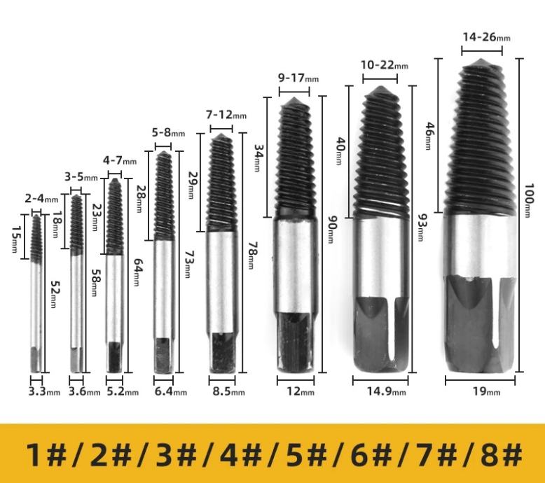 Veliki set izvlakača polomljenih vijaka, vodovodnih elemenata i drugih navoja od 2,5mm do 24mm.