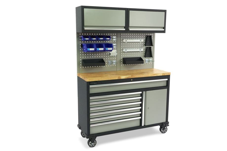 pakiranja 111 x 53 x 144 Cmtežina 113,8 Kg2 x fiksna kotača od 125 x 50 mm2 x rotirajuća kotača od 125 x 50 mm opremljeni kočnicom2 x šine 4 x viseća posuda za odlaganje dimenzija 10,5 x 14 x 7,5 cm3 x viseća posuda za odlaganje dimenzija 14 x 22 x 12 cm2 x čelična ladica za vješanje od 33 x 10 x 10 cm2 x 55 x 25 x 6 mm. U Kuka za zid alata4 x 85 x 6 mm dvostruka kuka za zid alata2 x univerzalni viseći stalak 37 cm. Širok2 x viseći stalak za umetanje ključa]]>