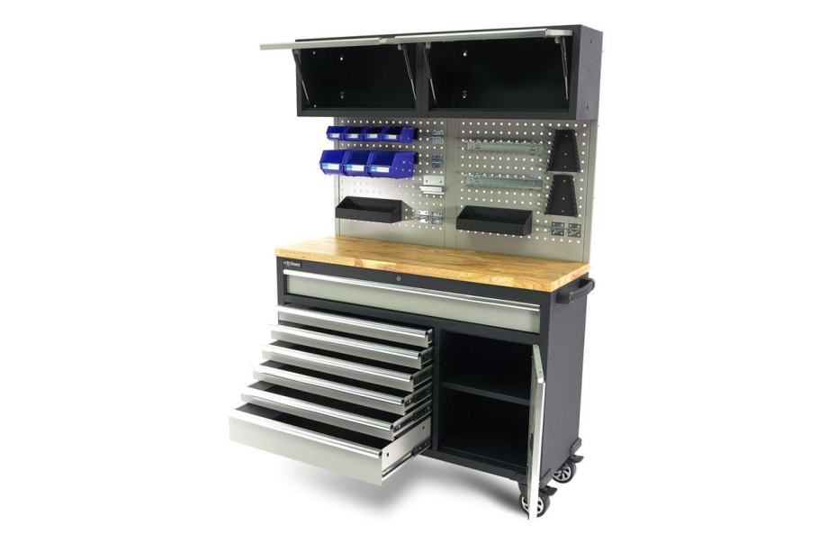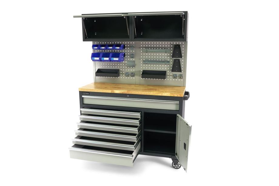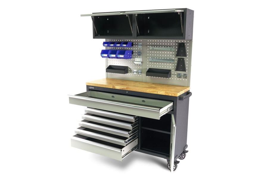 čvrsta drvena radna ploča služi kao osnova za obavljanje malih zadatakazahvaljujući dobrom rasporedu alata, potreban materijal uvijek imate pri rucistalci za vješanje na panelu radnog stola omogućuje da alati i obradaci budu na vidikuručka na desnoj strani ormara omogućava mobilnost po radionina vrhu nalaze se dva odvojena ormarića, svaki s posebnim vratima i ručkom - ovdje možete spremiti veći alatovaj mobilni radni stol robusnog dizajna savršen je dodatak velikim radionicamafiksni kotači ispod radnog stola pružaju dodatnu mobilnost, omogućujući vam da pomičete sustav bez ikakvih problemasvaka od ladica u ovom ormariću opremljena je klizačima s kugličnim ležajevimazbog toga se vrlo lako otvaraju i zatvarajuprotuklizne prostirke također osiguravaju da alati i materijali jednostavno ne klize Tehnički opis:ukupne dimenzije
