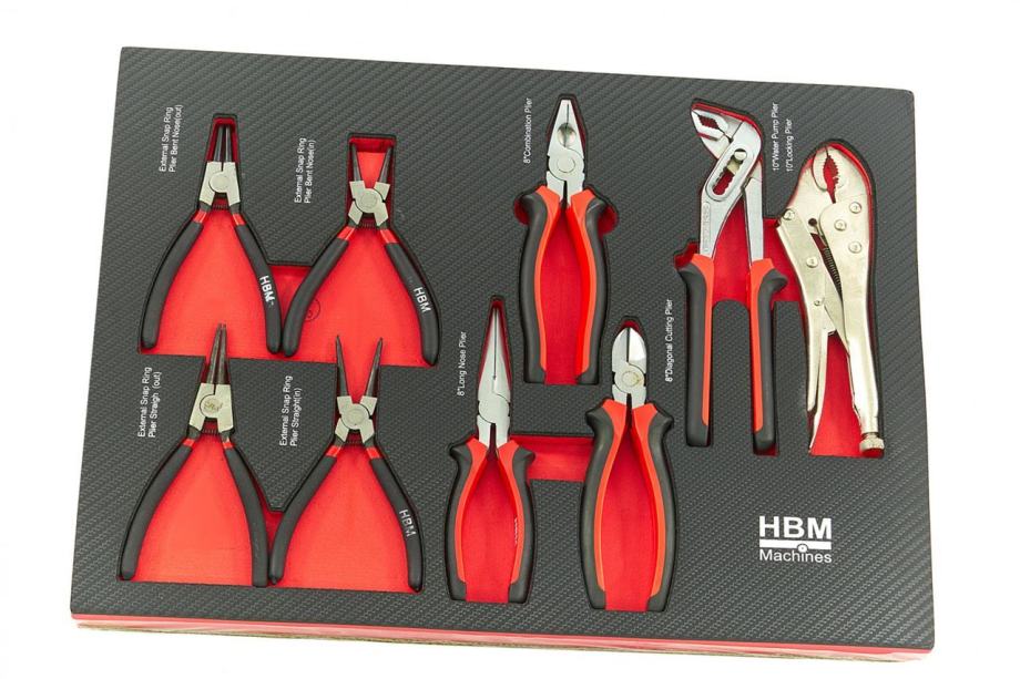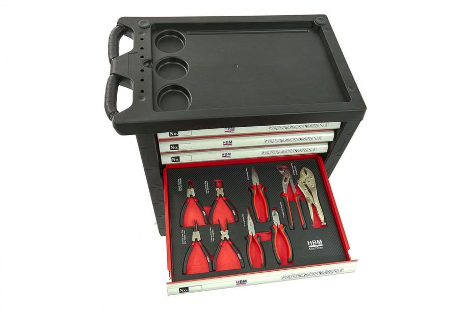 12, 13, 14, 15, 16, 17, 18, 19, 20, 21, 22 mm 3.ladica:kliješta za zaključavanje 10 "kliješta za vodenu pumpu 10 "telefonska kliješta 8 "kombinirane kliješta 8 "bočni rezači 7,5 "kliješta za vanjske ili unutranje prstenove/segere 4.ladica:set odvijača ravni sastoji se od. ravne 3x75, 3,5x75, 4x100, 5x150, 6,5x150, 8x175, stubby