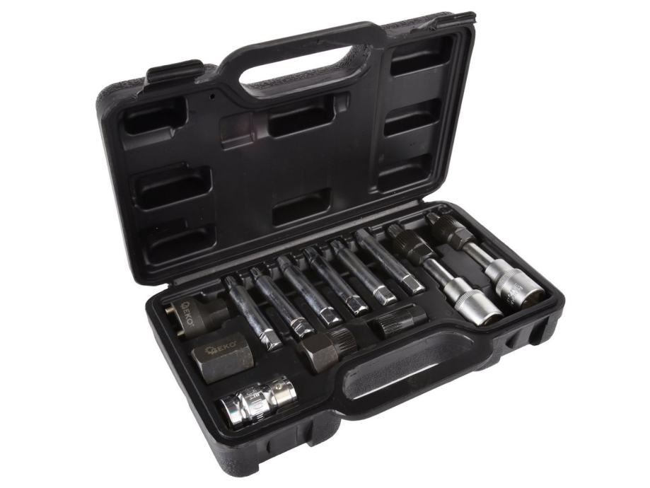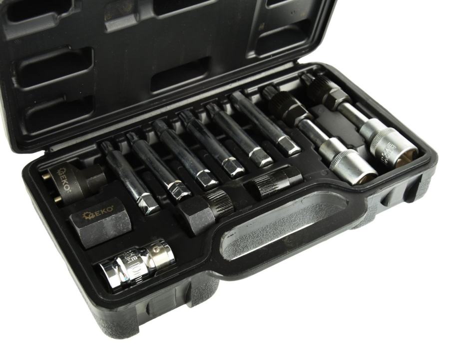 Set ključeva za ugradnju i demontažu alternatora. Ključevi su izrađeni od visokokvalitetnog CrV krom-vanadij čelika, što ih čini izdržljivima i otpornima na oštećenja. Ključevi omogućavaju istovremeno odvrtanje pričvrsnog vijka remenice (pomoću odgovarajućeg nastavka) i držanje remenice kvačilom (pomoću posebnog nastavka).