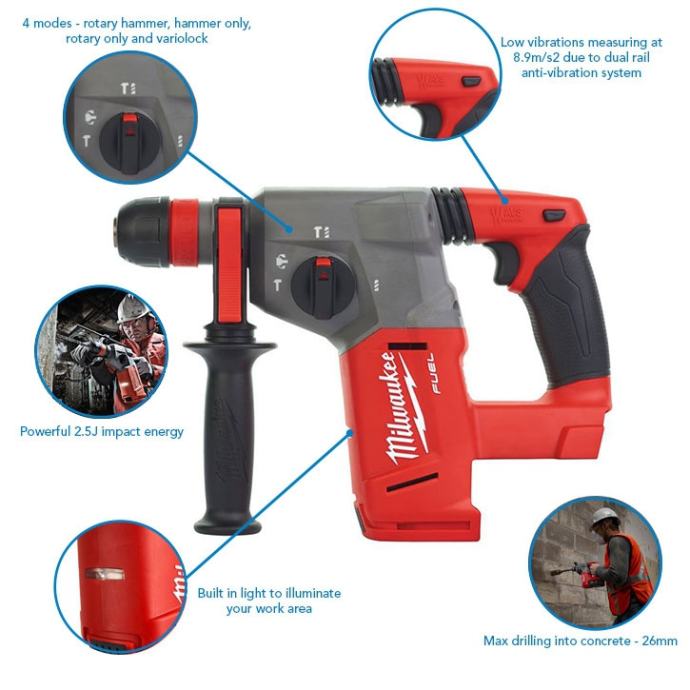 Drugi najteži udarni SDS čekić u svojoj klasi. Snažni čekićni mehanizam daje 2,5 J energije udarca pri niskim vibracijama od 8,9 m / s².