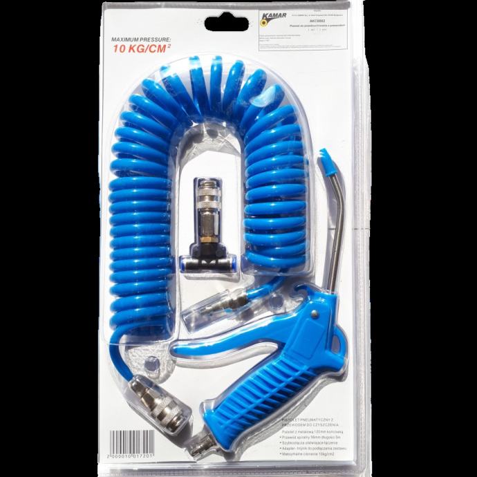 Pištolj za puhanje s crijevom od 5 m koje završava brzom metalnom spojnicom i cijevi za puhanje duljine od 12 cm. Set ima i dodatnu brzu spojnicu tzv. adapter-trojku za spajanje kompleta na zračnu instalaciju.