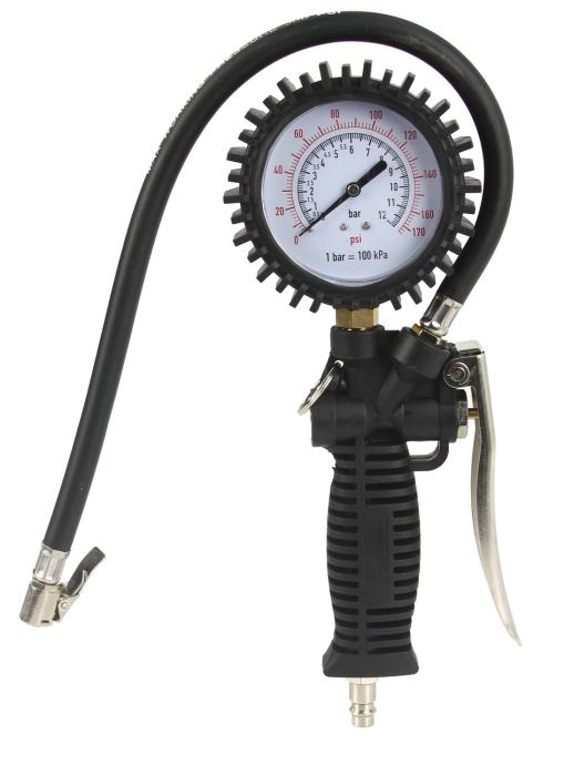 Pištolj za pumpanje guma ima manometar kojim je opremljen te ima skalu koja vam omogućuje mjerenje tlaka do 12 bara. Dodatno, manometar je opremljen zaštitnim poklopcem za sprječavanje oštećenja. Manometar je pričvršćen na tijelo pištolja standardnim metalnim navojem koji omogućuje zamjenu novim (u slučaju oštećenja). Tijelo pištolja ima ručku za vješanje i standardni vrh za brzu spojnicu. Pištolj je opremljen dvostupanjskim ventilom koji omogućuje ispuhavanje zraka pritiskom na okidač do pola.