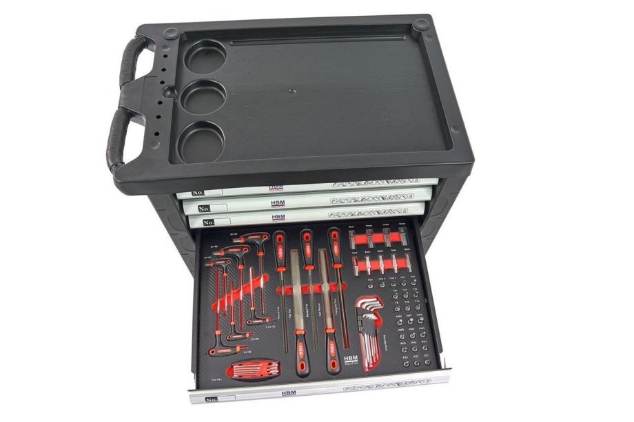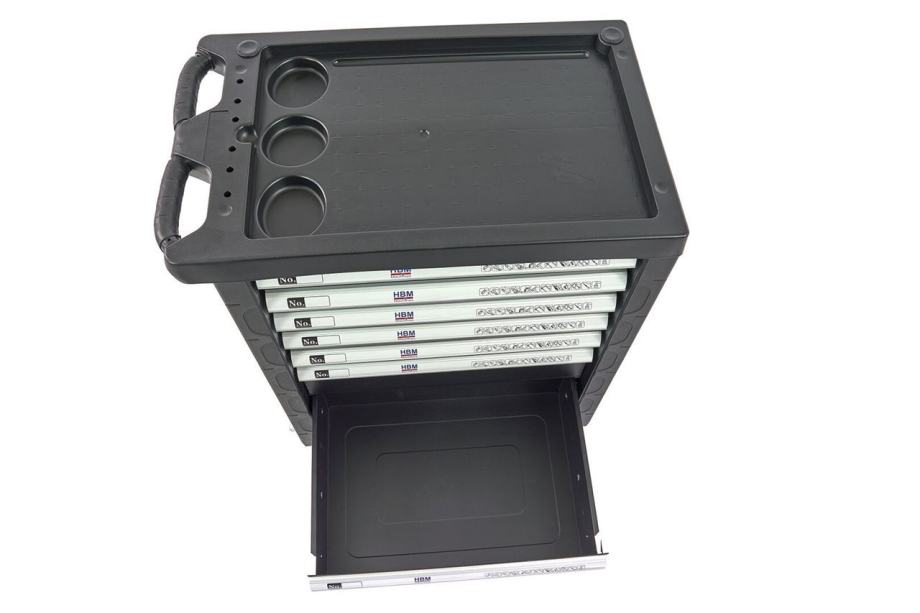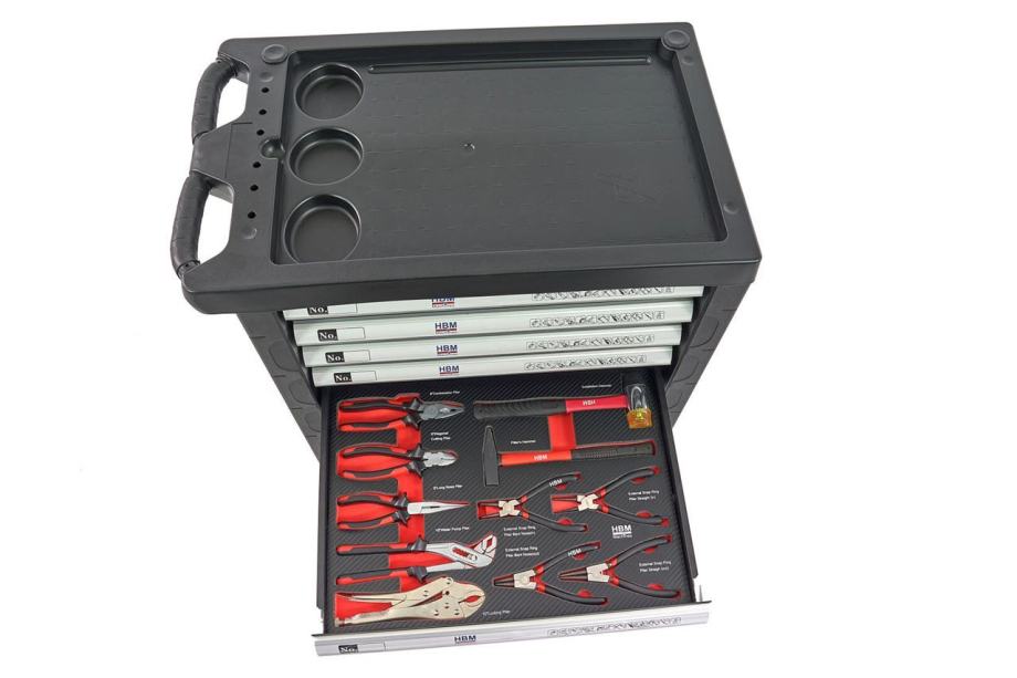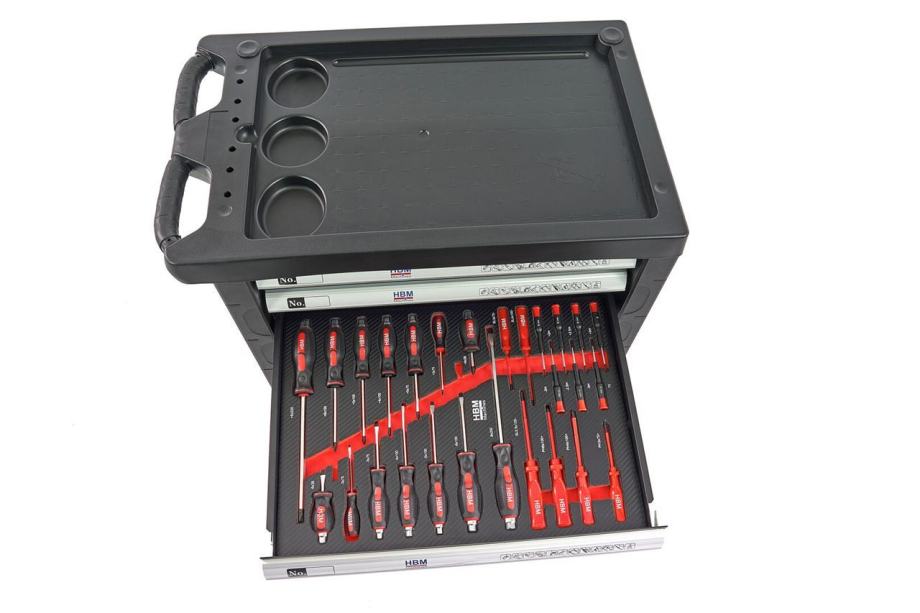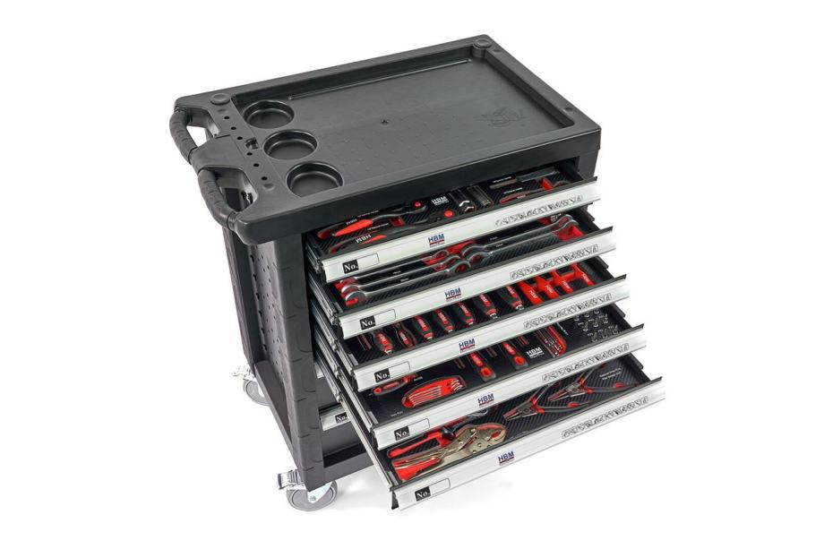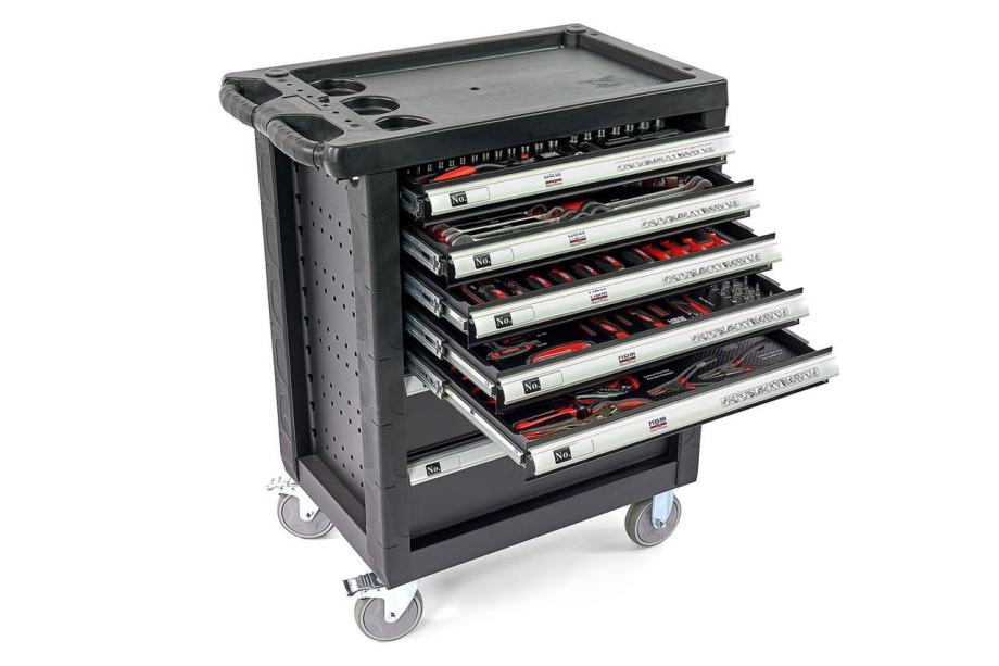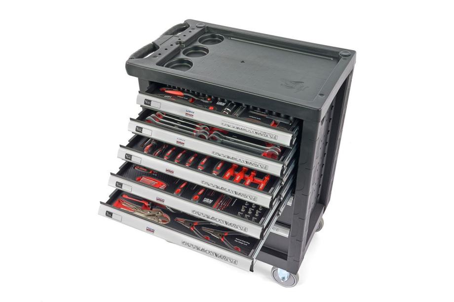 opremljena izdržljivim umetcima alata CARBON izgledakolica za alate opremljena su sa 7 ladica koje imaju okove sa ležajevimakolica za alate opremljena su s 2 fiksna i 2 okretna kotača, 1 s kočnicomkolica za alate se zaključavaju sa centralnoj braviladice se mogu zaključati po ladicisve ladice su opremljene otvarače na podizanje preko cijele širine ladica meko zatvaranje ladica "Soft close"dimenzije 78 x 48 x 105 cmtežina 79,5 KgKolica sadrže: 1. ladica: 1/4" premium račna1/4" zglob, 50 mm1/4" produžetak, 100 mm1/4" kratki nasadni ključevi: 4, 4.5, 5, 5.5, 6, 7, 8, 9, 10, 11, 12, 13, 14 mm3/8" premium račna3/8" zglob, 75 mm3/8" produžetak, 150 mm3/8" kratki nasadni ključevi: 8, 10, 11, 12, 13, 14, 15, 16, 17, 18, 19 mm3/8" Torx nasadni ključevi: E10, 11, 12, 14, 16, 18, 201/2" premium račna1/2" zglob, 125 mm1/2" produžetak, 250 mm1/2" kratki nasadni ključevi: 8, 9, 10, 11, 12, 13,14, 15, 16, 17, 19, 21, 22, 24, 27, 30, 32 mm2. ladica: ključevi na račnuveličine: 6, 7, 8, 9, 10, 11, 12, 13, 14, 15, 16, 17, 18, 19, 20, 21, 22 mmokaste ključeveveličine 6 x 7, 8 x 9, 10 x 11, 12 x 13, 14 x 15, 16 x 17, 18 x 19, 20 x 22 mm3. ladica:samozatezna kliješta, 250 mmkliješta za pumpu vode 250 mmkombinirana kliješta, 200 mmravna kliješta, 200 mmkliješta za rezanje, 150 mmsavijena kliješta za unutarnji uskočnik, 170 mmravna kliješta za unutarnji uskočnik, 170 mmsavijena kliješta za vanjski uskočnik, 180 mmsavijena kliješta za unutarnji uskočnik, 180 mmčekićgumeni čekić4. ladica:ravni odvijači:3x75, 3,5x75, 4x100, 5x150, 6,5x150, 8x175, 6x38križasti odvijači:PH 0x75, PH 1x100, PH 2x100, PH 2x125, PH3x150, PH 4x200, PH2x38Izolirani ravni odvijači3x75, 4x100, 5.5x125, 6.5x150križni izolirani odvijači PH 1x100, PH 2x100set preciznih odvijačaravni: 1.8x40, 2.0x40, 2.5x40, 3.0x40križni: PH 0x40, PH 00x40, PH 000x405. ladica:T imbus s okruglom glavom:2 x 100, 2.5 x 100, 3 x 100, 4 x 150, 4.5 x 150, 5 x 150, 6 x 150, 8 x 200, 10 x 200 mmT imbus:2 x 100, 2.5 x 100, 3 x 100, 4 x 150, 4.5 x 150, 5 x 150, 6 x 150, 8 x 200, 10 x 200 mmset turpija, trokut, ravna, okrugla, kvadratna, polumjesecset imbusa na T ručku veličine 2 x 100, 2,5 x 100, 3 x 100, 4 x 150, 5 x 150, 6 x 150 mmset nasadnih ključeva prihvata 1/4 " sastoji se odveličine 5, 6, 7, 8, 9, 10, 11, 12, 13 mm.set imbusa u držaću 1,5, 2, 2,5, 3, 4, 5, 6, 8, 10 mm.torx set (u držaču) T9, T10, T15, T20, T25, T27, T30, T406. i 7. ladica su prazne]]>