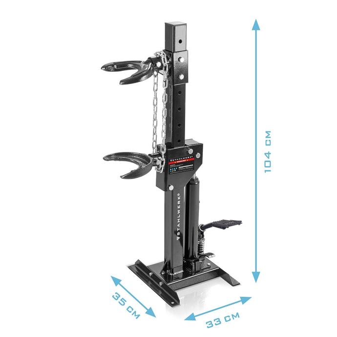 STAHLWERK kompresor opruga je pravi alat za stezanje i opuštanje amortizirajućih opruga tijekom održavanja i skidanja podupirača vozila. Ima maksimalnu silu zatezanja od 1 tone i može se koristiti na različite načine za različite modele opruga. Izrađen od visokokvalitetnog lakiranog željeza otpornog na koroziju, kompresor podupirača može izdržati čak i velika opterećenja. Opružne kopče izrađene su od vrlo izdržljivog lijevanog željeza i stoga su robusne, otporne na habanje i izdržljive. Postoji sedam rupa na stupu gdje se zatezač amortizera može fleksibilno prilagoditi različitim vrstama opruga amortizera. Četiri opružne kopče i čvrst lanac osiguravaju pričvršćenje opruge. Nožna papučica upravljanja hidrauličnom pumpom omogućuje udobnu i sigurnu upotrebu, štedi vrijeme i trud tijekom rada, a stabilna baza jamči stabilnost u svakom trenutku. Idealan za profesionalnu upotrebu u radionicama za vozila iu sektoru kućnih majstora.
