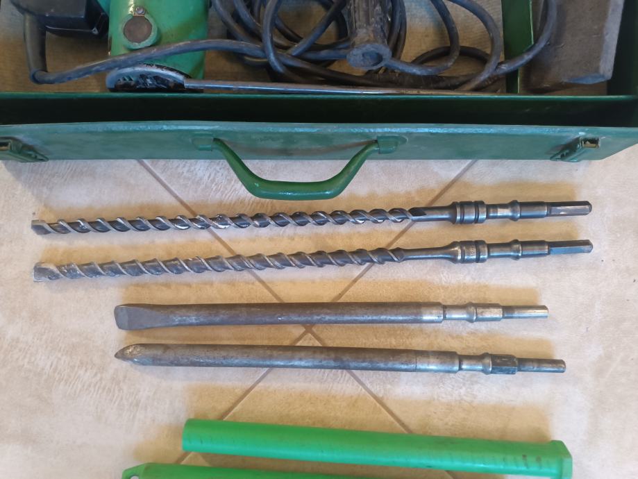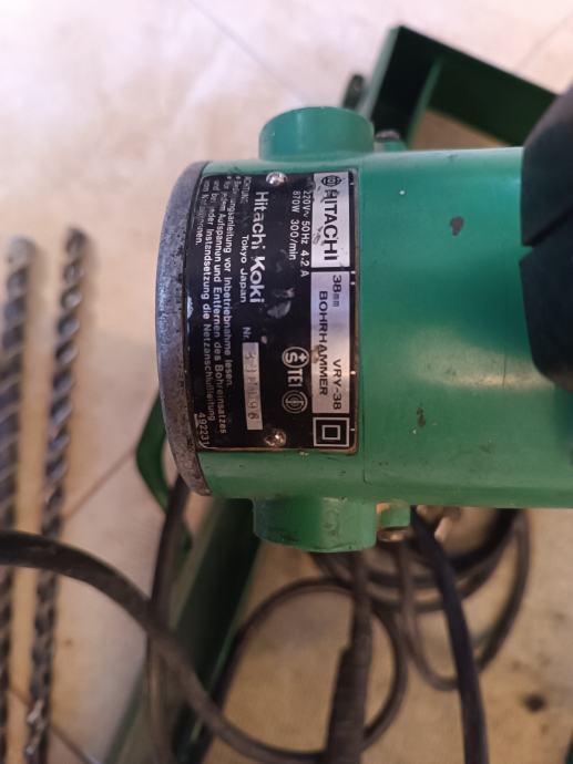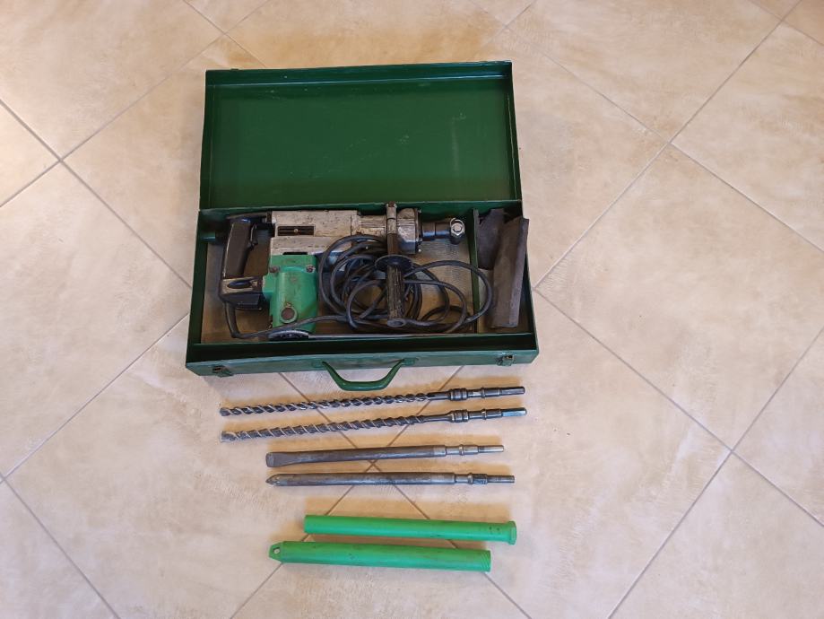 Hitachi štemalica bušilica ,sa dva svrdla , špicom i škarpelom. Ispravna radi ,jedino prihvat ne zadržava špicu ili svrdlo.