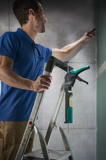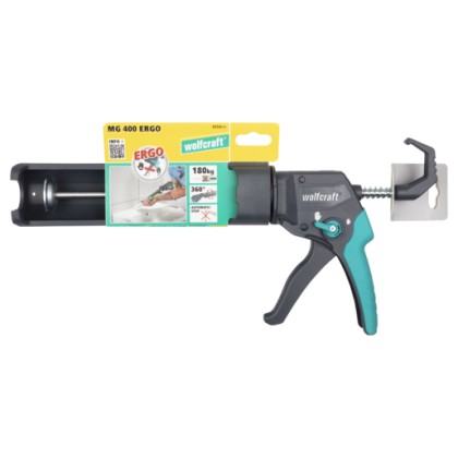 S visokim izlaznim tlakom od 180 kg pištolj za patrone MG 400 ERGO nije prikladan samo za silikon i akril, već također jednostavno i bez zamora obrađuje ljepila iz patrona zapremnine 310 ml. Za najbolju ergonomiju pištolj za patrone MG 400 ERGO možete udobno prilagoditi veličini ruke zahvaljujući podešavanju širine ručke. Tako 2-komponentna ručka udobno i precizno leži u ruci i omogućuje rad bez zamora čak i tijekom duže upotrebe. Za individualnu prilagodbu radnog kuta, kalup patrone možete okrenuti za 360°. Kad se pištolj spusti, automatsko zaustavljanje kapanja sprječava neželjeno naknadno curenje materijala i jamči čistoću nakon svake primjene. Kuka za ljestve nudi dodatnu udobnost. Na nju možete jednostavno objesiti MG 400 kada vam treba slobodna ruka.