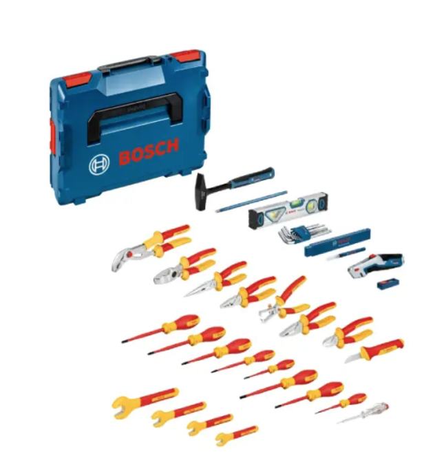 Set uključuje 8 VDE odvijača, 4 VDE ključa, 7 Vedette ključeva, 1 nož za kabele i 1 jednopolni tester faza. Također uključuje 1 magnetsku libelu, 1 čekić, 1 sklopivo ravnalo, 1 dlijeto, 1 marker, 9 šesterokutnih ključeva 1,5-10 mm, 1 uvlačivi hobi nož i 1 set zamjenskih oštrica