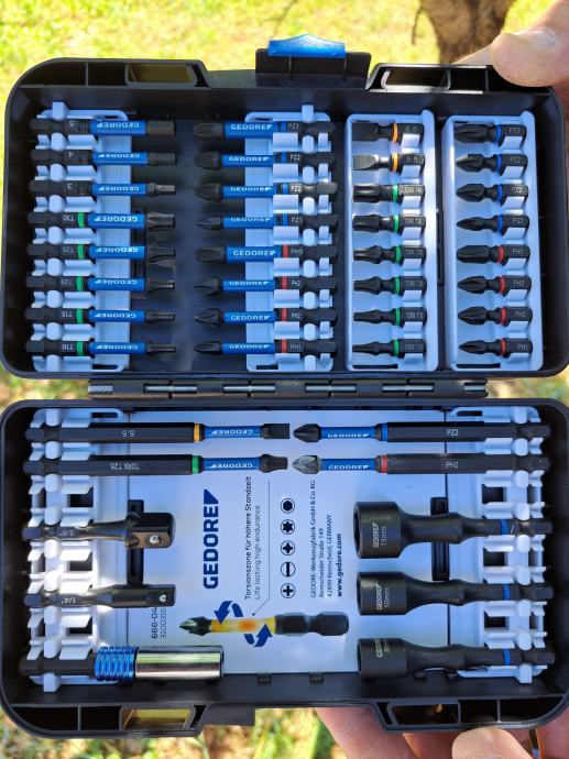 Gedore set bitova 666-042 / Code no. 3100316. Nekorišteni set bitova za odvijače, pogodno i za udarne odvijače. Dimenzije 120 mm x 45 mm x 190 mm; masa 0,67 kg. U preglednoj i čvrstoj kutiji, bitovi vrlo kvalitetne izrade. 6 slobodnih mjesta za mogućnost ubacivanja dodatnih bitova po želji.