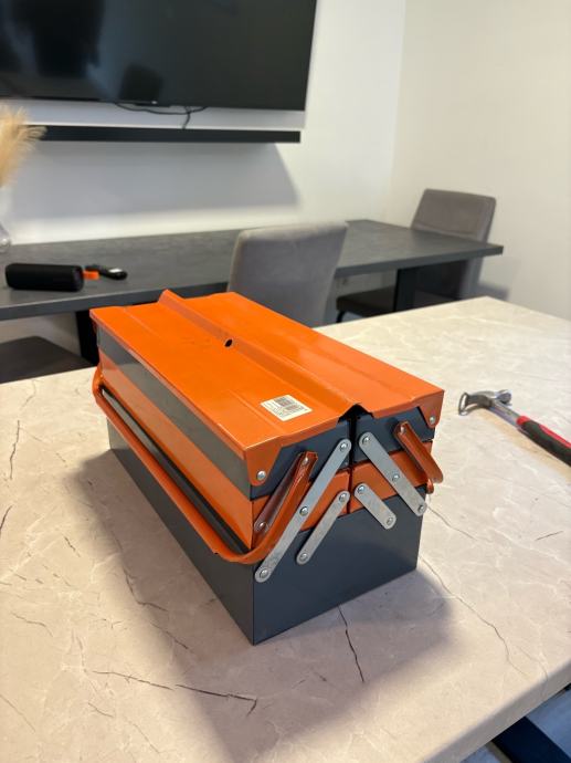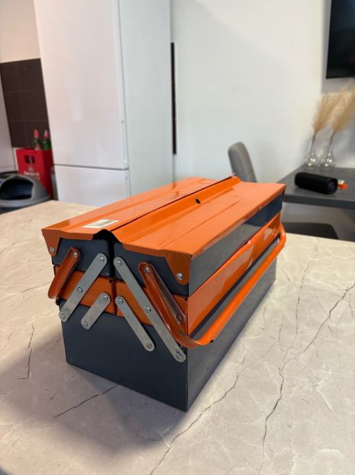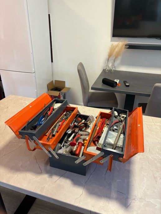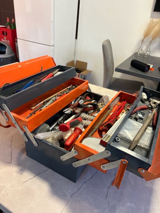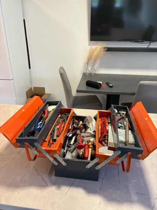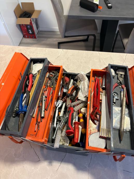 Kofer je čvrst, stabilan i praktičan, s više pregrada koje se otvaraju u razine, što omogućuje odličnu preglednost i jednostavan pristup svemu što je unutra. U njemu se nalazi raznovrstan ručni alat, od odvijača, kliješta i rezača do čekića, skalpela, metra, konektora te električarskog pribora. Sve je uredno posloženo i u potpunom funkcionalnom stanju.