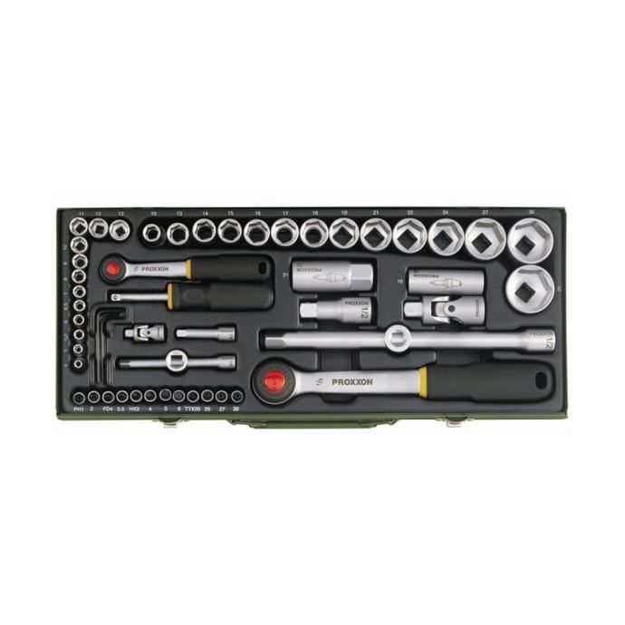 Garnitura nasadnih ključeva s račnom 1/4“ i 1/2“ 56-dijelna. Najviša kvaliteta, premašuje DIN/ISO zahtjeve za čvrstoćom i obrtnim momentom. Pojedinačna tolerancija na visokoj razini koja prelazi granice norme. Za garniture nasadnih ključeva naši testni mehaničari preferiraju metalne kutije: čvrste, kompaktne – alat je jasno posložen i zauzima malo prostora. Na poklopcu kutije nalazi se tablica sa oznakama od M 1,6 – M 24 sa preporučenim silama zatezanja. Sistem za promjenu smjera ugrađen direktno u mehanizam račne. Nekoliko od 44 zuba pouzdano prenosi veliki okretni moment. Gumb za brzo odvajanje nasadnog ključa. Glava i tijelo račne napravljene iz jednog komada kovanog CrV čelika. Dvostruko poniklana i kromirana sa mat završnom obradom. Drška od NEOPRENA otpornog na ulje i kiseline, s rupom za odlaganje. TORX bitovi izvedeni su sa uvučenim rubom. Svi nastavci i pribor iskovani su iz 31Crv čelika. Udio visokokvalitetnog karbona osigurava konstantnu čvrstoću. Dubinsko, ravnomjerno kovanje garantira sigurnost na šesterokutnom prihvatu i neće predstavljati problem pri kontaktu sa maticom. Tanka stjenka ključa omogućuje bolji prihvat i održava snagu za veliko opterećenje. Ulazni žlijeb dozvoljava ključu da lagano klizne po stjenkama. Mašinski obrađen četverokutni prihvat osigurava račni pravilan prihvat. Počevši sa promjerom vanjskog ruba ključa od 19mm sužava se prema četverokutnom kraju radi lakšeg rukovanja. Dvostruko niklana i kromirana izvedba osigurava optimalnu zaštitu vanjske površine. Račna, produžetak, zglob i odvijač za nasadne ključeve u veličini 1/4" i 1/2"